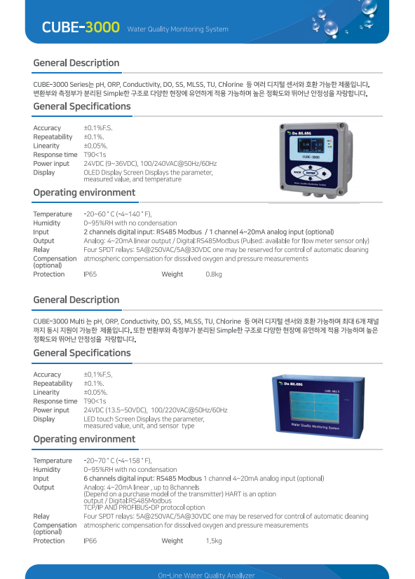 CUBE-3000 Series는 pH,ORP, DO,SS,MLSS등 여러 디지털 센서와 호환 가능한 제품 입니다.